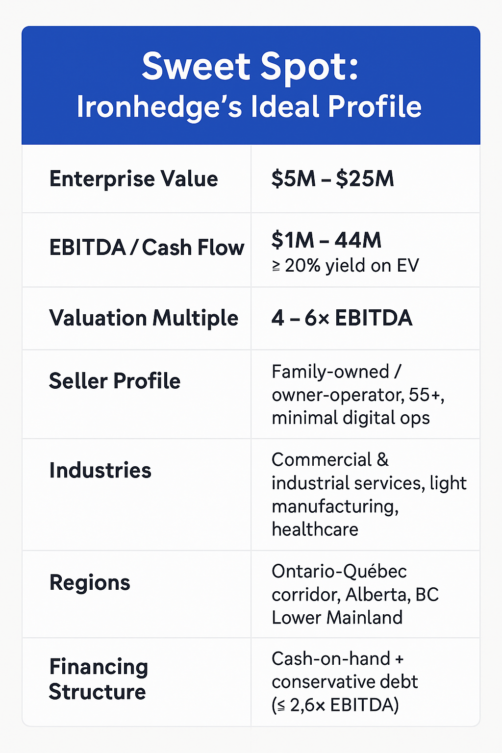 Ironhedge Management Inc. acquires Canadian lower-mid-market businesses with enterprise values between $5–25 million. We focus on companies with durable earnings, strong cash flow, and limited institutional attention, typically owner-operated firms navigating succession or scale challenges. These businesses often lack digital or operational optimization, creating clear opportunities for hands-on value creation.